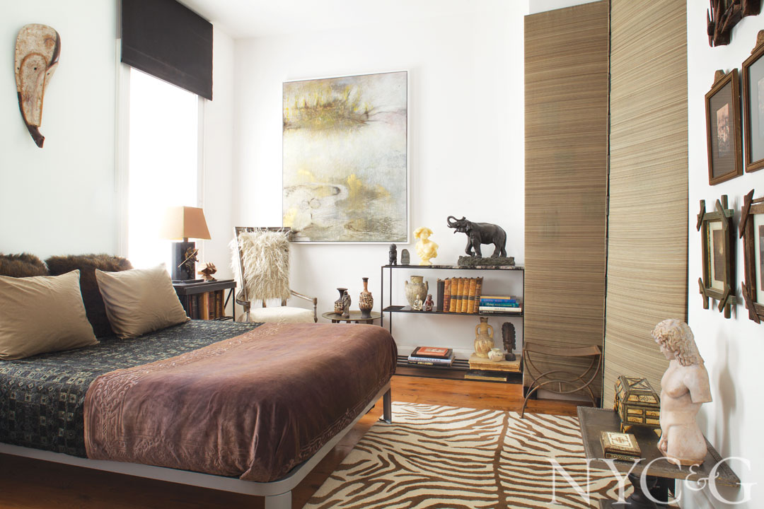 Among the exotic accents in the guest room are a tribal mask from Malawi and a zebra-print rug from West Elm.