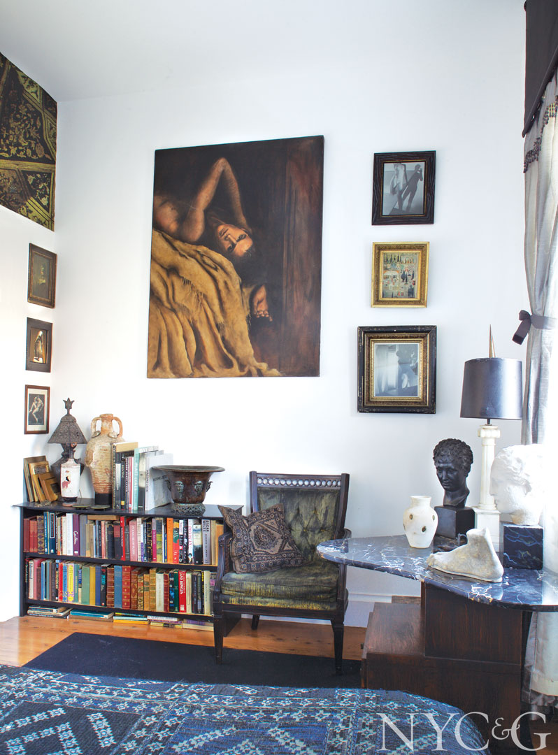 Across the room, an Empire Revival sofa re-covered in a synthetic horsehair and metallic brocade from Designtex sits beside a red Filikli Tulu rug from Central Anatolia in Turkey.