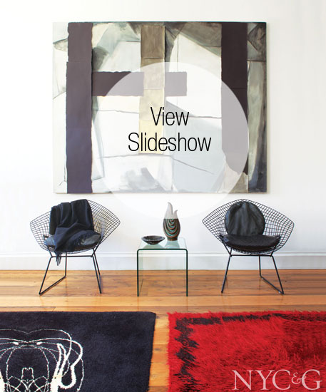 Then Hurricane Sandy flooded him out. “My building was hit really hard, and I was homeless for two months,” says Gillette, who trekked 125 miles north to Hudson, New York, to stay with his elder brother, Rick (né Francis Ricardo), a renowned hair and makeup artist. Gillette was cautiously smitten with Hudson’s rich architectural history and abundant antiques and home design shops, so he packed up and moved there, into a brand-new Colonial-inspired townhouse. “I’m renting with an option to buy,” he explains, “which is why it’s designed as a showcase for my art, with an emphasis on what you can do without tearing down walls.”