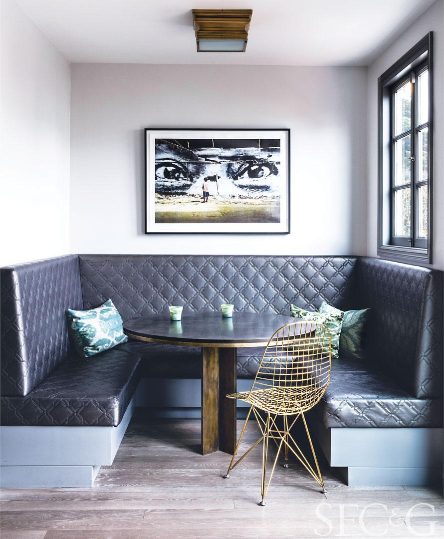 A Visual Comfort ceiling fixture complements a custom metal and brass table. Banquette is by Artistic Design for Living.