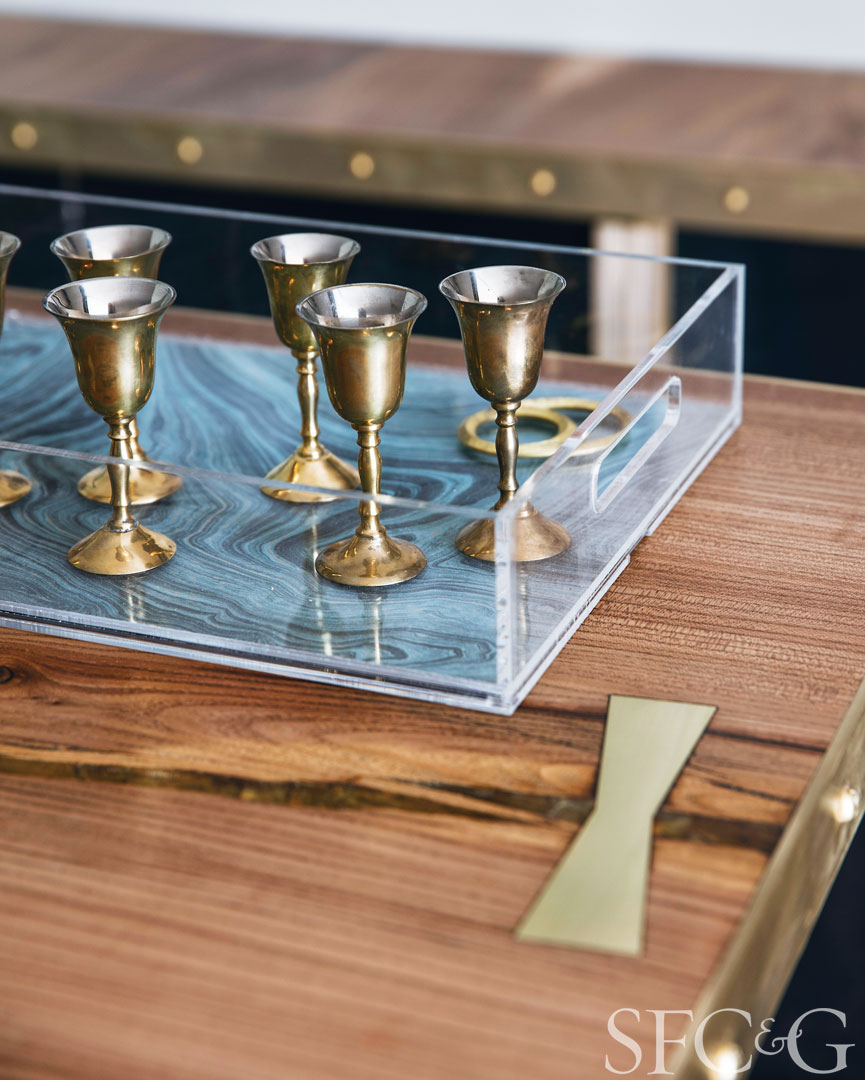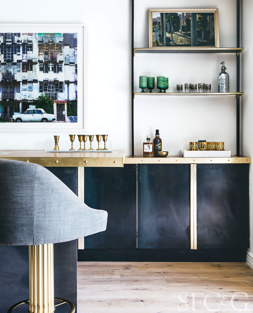 The bar, designed with Mason Rockwell Design, is made of elm and brass; brass cordials are from Le Cart.