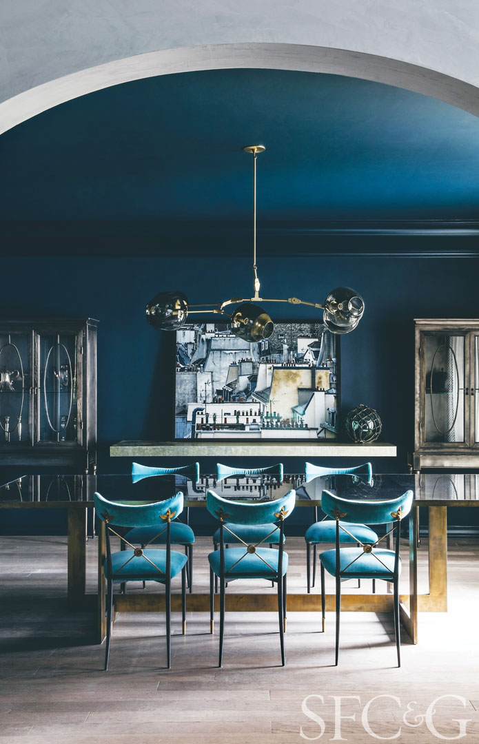 A Lindsey Adelman chandelier branches out over the custom dining table, designed in collaboration with Mason Rockwell Design. Chairs are from Jonathan Adler.