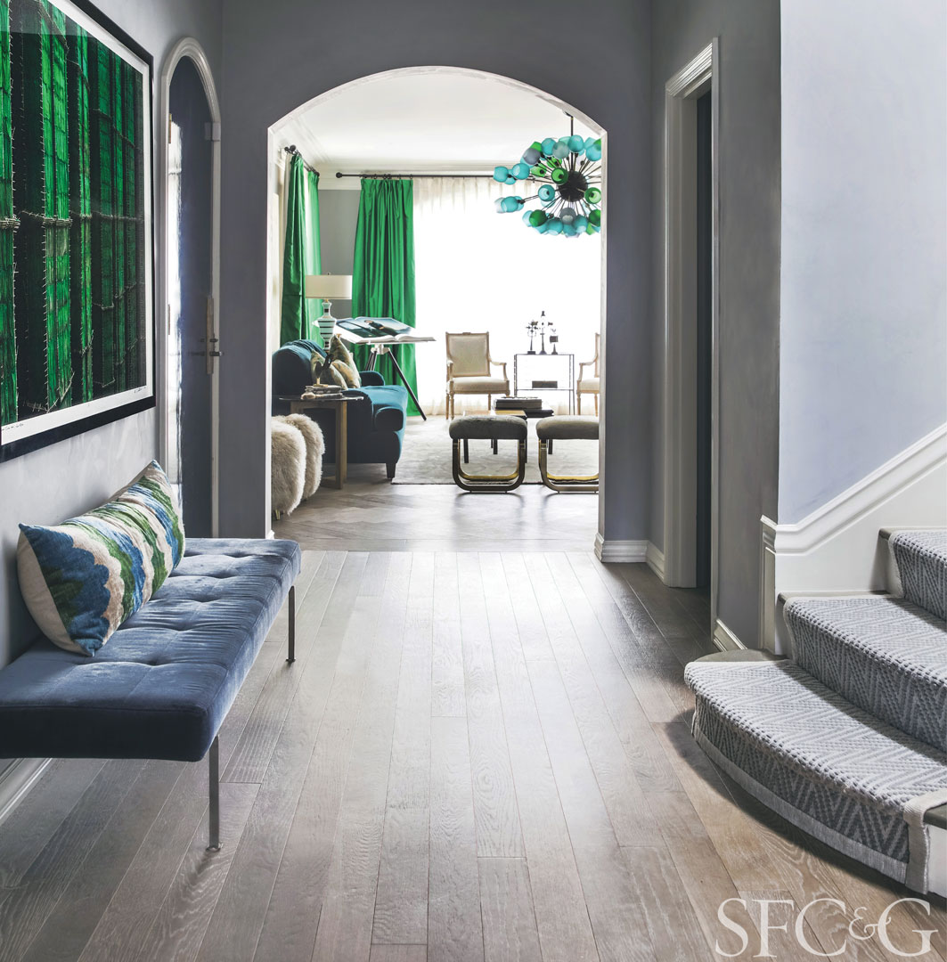 Green echoes from the living room into the hallway in artwork by Peter Steinhauer. Bench is from Big Daddy’s Antiques. Stair carpet is through Stark.