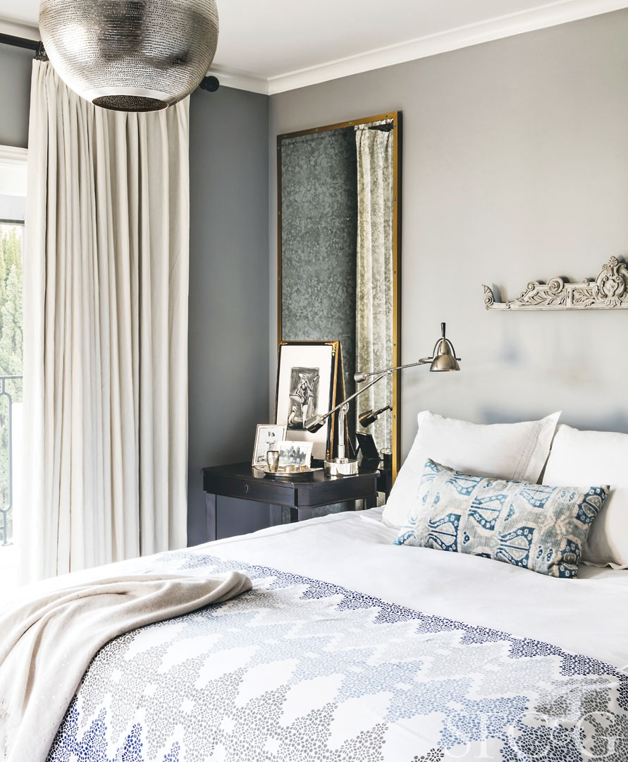 Farrow & Ball’s soothing Manor House Gray envelops the master bedroom. Mirror and lamp are from RH; nightstand is through Gabriella Sarlo. Silk velvet ikat bedding is from Sferra; cashmere throw is from Jessie Black.