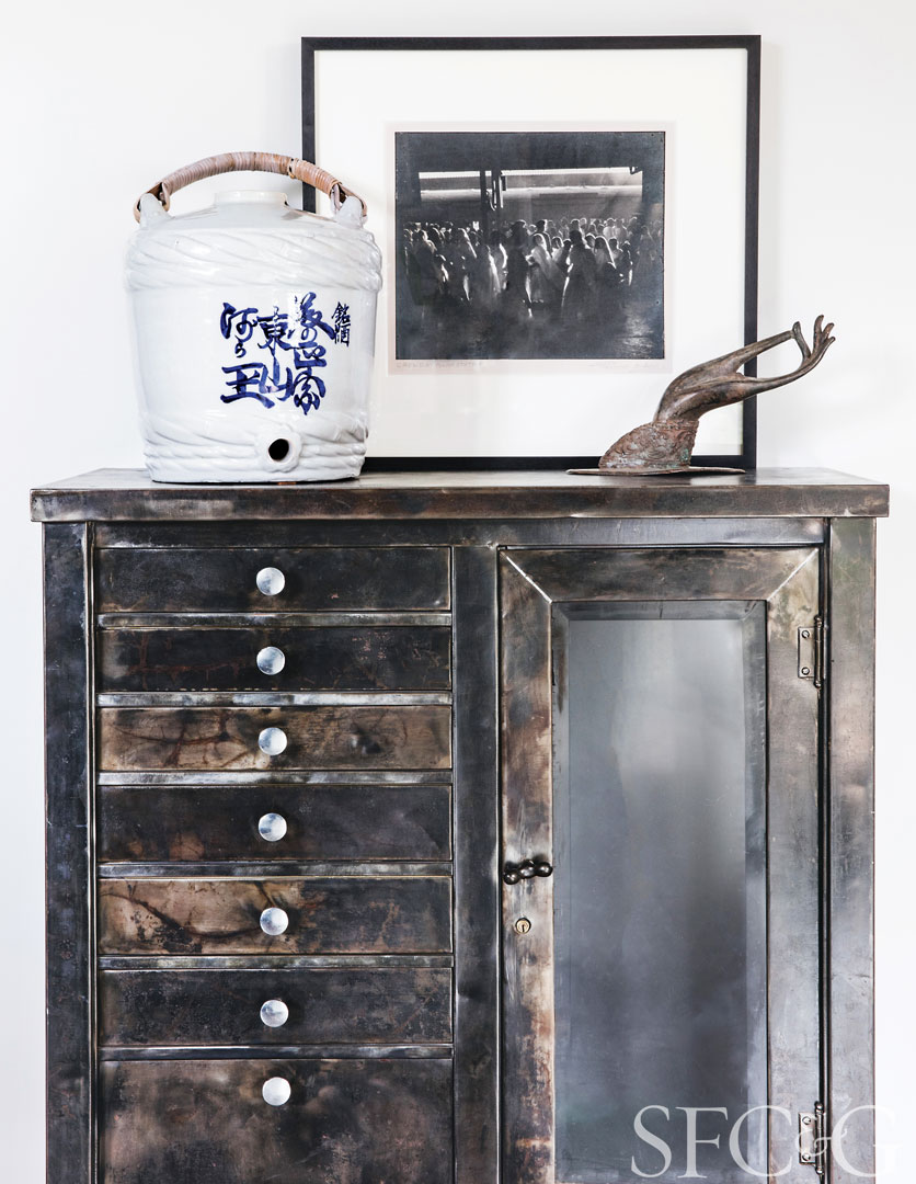 A metal cabinet from Big Daddy’s Antiques holds a curated collection: an antique sake jar sourced in Tokyo, a Cambodian bronze hand and one of Lithander’s favorite works, a photograph of India.