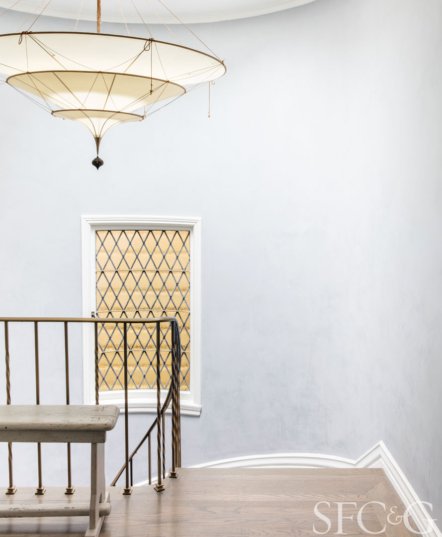 A Fortuny chandelier through Sloan Miyasato floats at the top of the stairs.