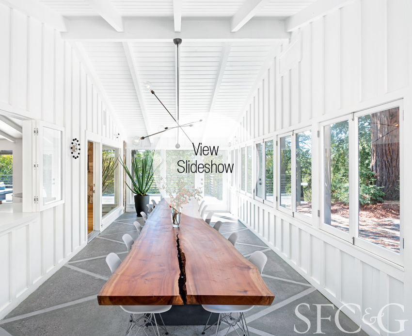 The site of the two 1950s ranch-style buildings—three acres of evergreen-filled woods—feels rural but is actually within walking distance of Healdsburg’s lively town square. When Burry and his longtime friend and co-investor, NicholsBooth Architects’ President Gary Nichols, first saw the main house, its clapboard exterior was hidden beneath a mass of brambles and ivy, but they could still spot its potential. “Inside the layout was a product of California modernism, but its aesthetic hadn’t actually taken root,” says Burry. “We just helped it along by opening everything up.”