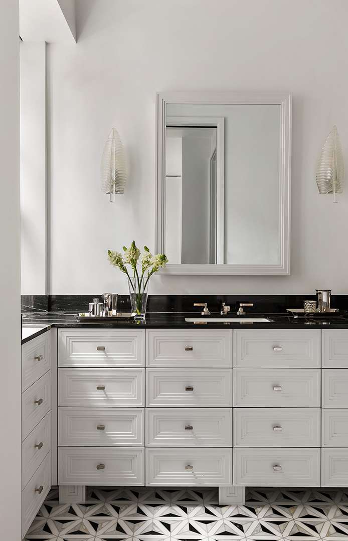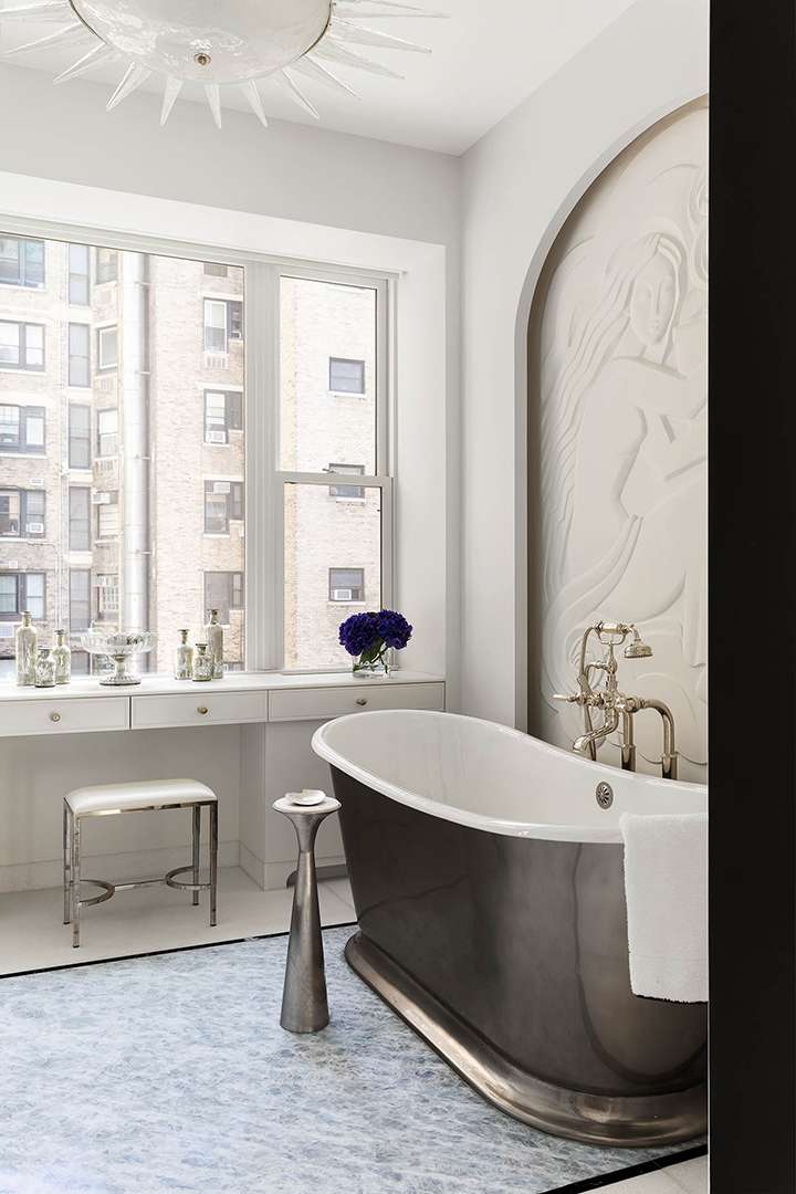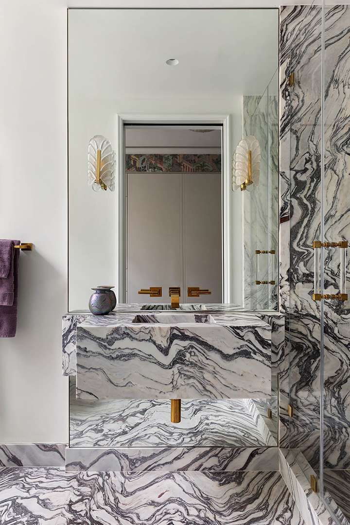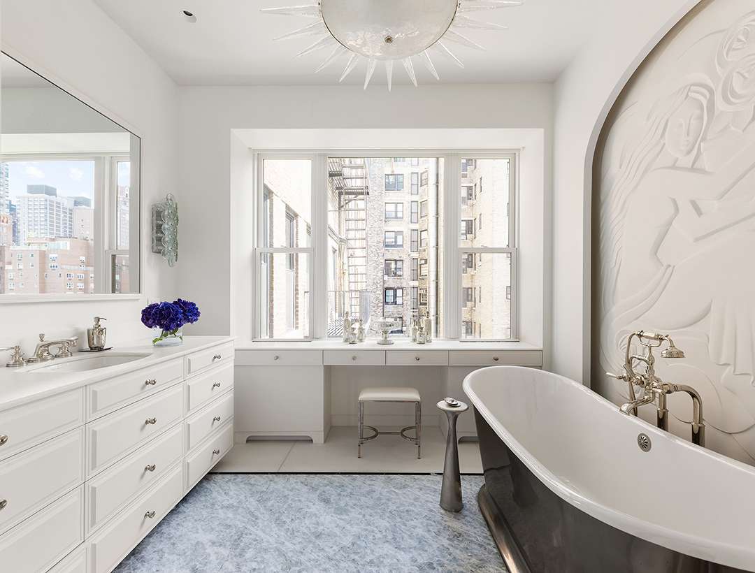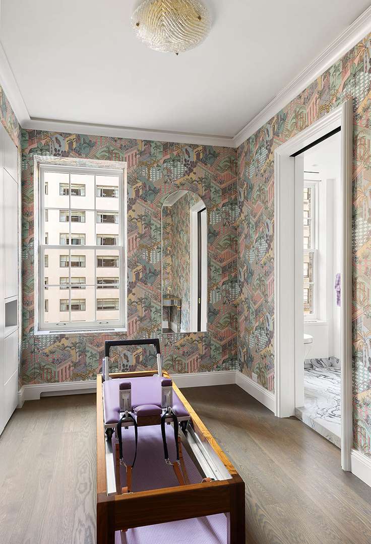 Tucked away from these entertaining areas looking out to Central Park, the primary suite is more muted in its tones but also brims with bespoke treasures. It holds an Art Nouveau fireplace sourced from Paris, a custom dressing room with a mother-of-pearl island, and a bathroom with a custom Art Deco bas relief depicting a goddess above the tub.
