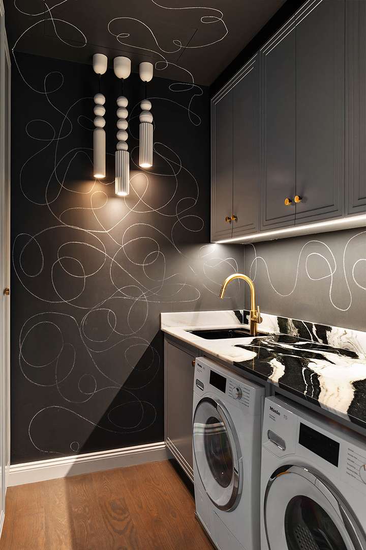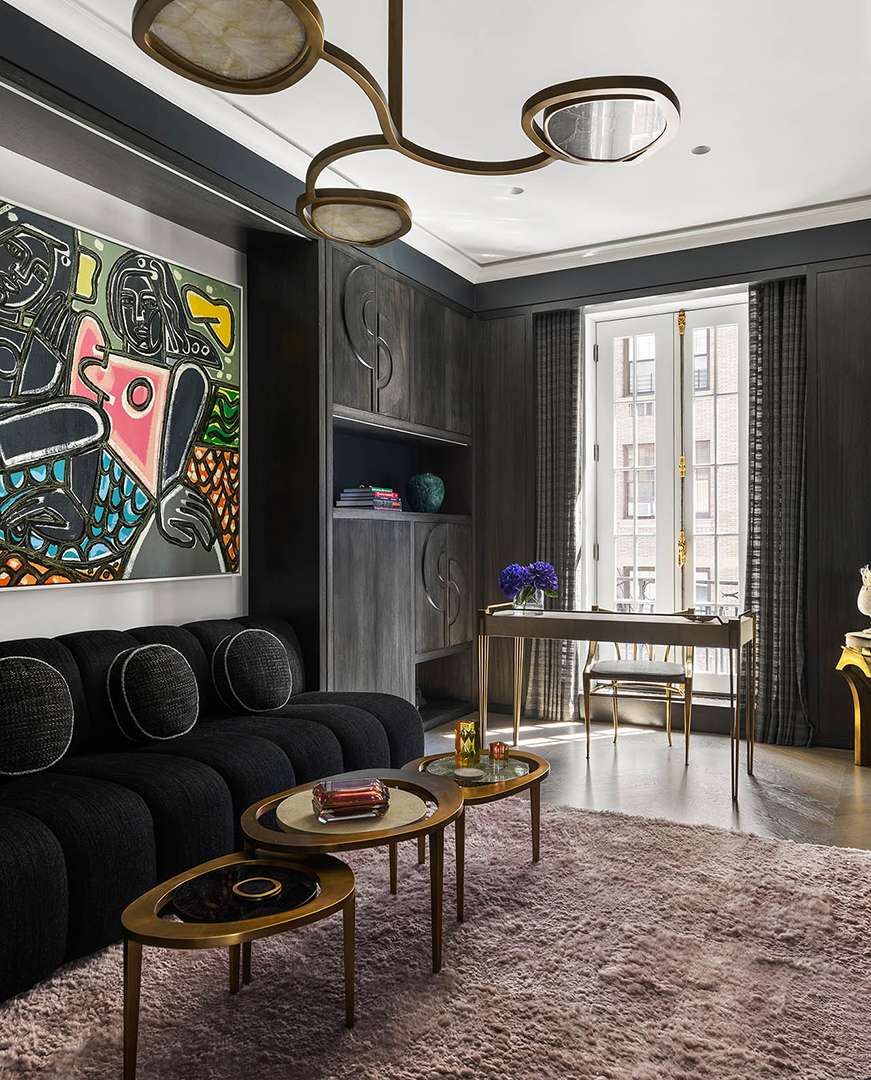 According the a feature in Architectural Digest, Richter was inspired by Art Deco drama as well as the mystique of the moon and stars when she gut renovated her three-bedroom residence. You can see how the night sky plays into the design with curving lines and shimmering materials seen throughout, plus celestial-esque light fixtures that foster a feeling of wonder and fascination. Femininity is also at the forefront here in more ways that one. Most concretely, Richter hung three paintings by women in the foyer and placed a sandstone bust of a woman in this focial space.