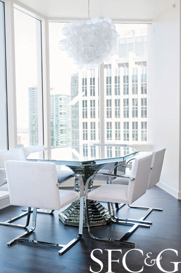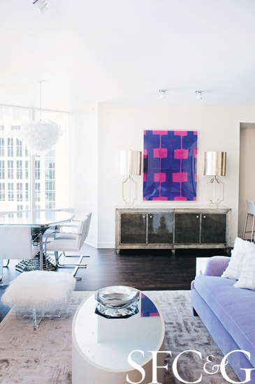 Stepping into the foyer of what one anticipates will be a streamlined white space in a San Francisco high-rise, a violet cowhide runner is the first element that defies expectations. As it leads past a silver-leafed powder room and into a living room with a magenta Art Deco–style armchair and a lilac Donghia sofa, it becomes evident that this will not be your typical “white box.” For interior designer Eche Martinez, the mission was instead to create a suprisingly spirited residence: “I love classical architecture, but this space was a clean modern slate and needed something a little more theatrical,” he says. “The challenge was to create a home that was bold, beautiful, personal and unique.”