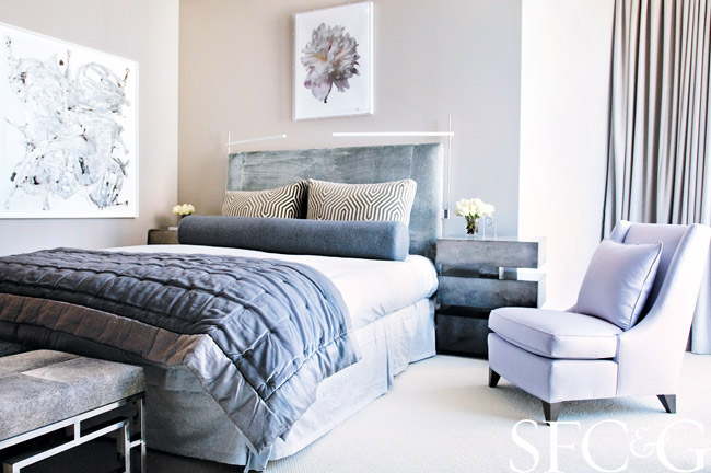 The master bedroom was swathed in shades of gray, from pale, pearly gray slipper chairs to a charcoal silk velvet headboard and parchment nightstands finished in varying shades of high gloss resin “to create an ombré effect and bring dynamism into the space.” At the foot of the bed, he placed a pair of pony-skin benches, a warm and fuzzy element found in accent pieces throughout the home including a Lucite stool with a Mongolian lamb seat. “It has a kind of Monsters, Inc. vibe,” Martinez says with a laugh. “This is young San Francisco modern. It’s a little edgier.”