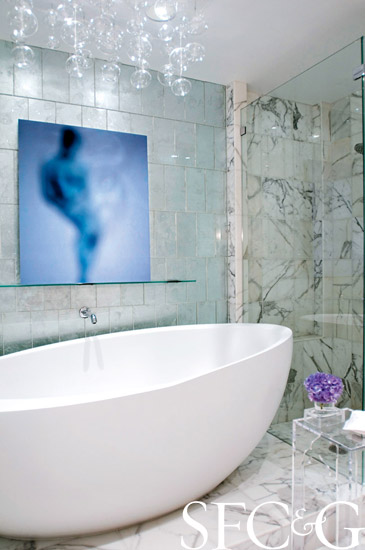 The master suite required a “calm, classical palette,” notes Martinez. And, although the apartment had never been previously occupied, the master bathroom was given a gut renovation, replacing generic beige and stone finishes with glamorous honed-marble floors and oversized silver-foil–backed glass wall tiles. Above the freestanding matte-white Waterworks tub, contractor Peter Englander, who worked with Martinez on the overall remodel of the home, created an illuminated glass bubble installation to Martinez’s specifications and a glass shelf that displays artist Bill Armstrong’s Renaissance 1053. The client “wanted a dreamlike spa retreat,” the designer says, “something that was feminine and fun.”