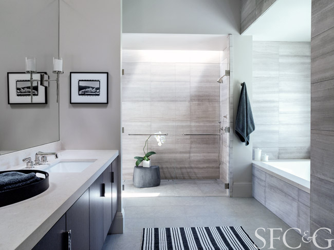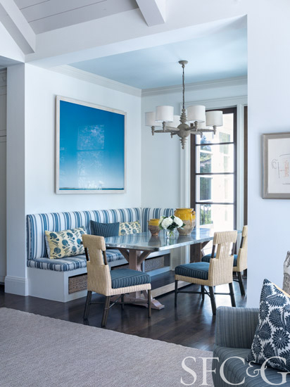 Considering as well that the individual spaces are quite lofty and the scale of doors oversized, achieving a level of intimacy in a house this grand could be considered miraculous. Instead of the formality that might be expected in a home of this dimension, however, Martin chose to give it a more relaxed sensibility—a comfortable elegance suited to California living. She began by carefully considering proportion and selecting furnishings that were appropriately scaled to each room. Next, she chose a neutral palette, underscored with plenty of textured, natural fabrics, to reflect the Bay Area’s organic sensibility. The understated hues also provide a backdrop for the furnishings, which, in their coastal grays and blues, wood and well-worn leather, add richness and coziness to the rooms. Martin also appreciated that the deep crown moldings and baseboards bestowed a charming heritage quality upon the house, and left them in place. As she notes, because they’re bereft of any ornate carvings, the vibe remains fresh. “The homeowners really appreciate modernism, but they have a traditional streak, too,” she says. “The bones of the house perfectly accommodated both styles.”