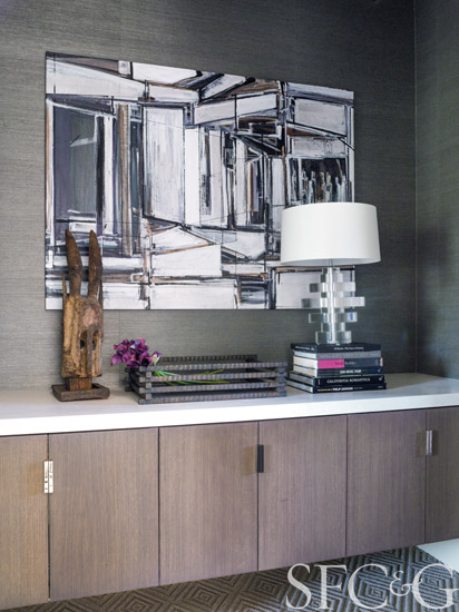 Martin is a firm believer that art is also integral to a home’s spirit. Here, such modern pieces as the colorful abstract in the dining room or the moody blue canvas in the library—both from Dolby Chadwick Gallery in San Francisco—have the ability to enliven or subdue a space. The gallery wall at the entry—a lively arrangement of new works by California artists and pieces from the homeowners’ collection—is a marriage of old and new, symbolizing how the two elements come together in a home to achieve a meaningful space.