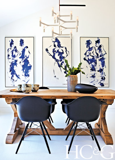 In the dining area, a Crown Minor chandelier by Jehs + Laub is suspended above a salvaged-pine table. Works by a Balinese artist hang on the wall.