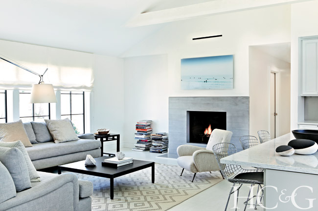In the living room, a Gio Ponti–style armchair upholstered in linen and a Mark Albrecht Studio coffee table in a blackened-steel finish rest atop a hand-knotted wool Berber area rug from the Rug Company. A print by Carine Magescas hangs above the fireplace.