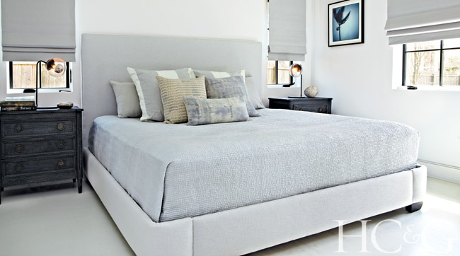 In the master bedroom, a Serena & Lily Octavia bed is flanked by a pair of cerused-wood bedside tables and Roll & Hill lamps.