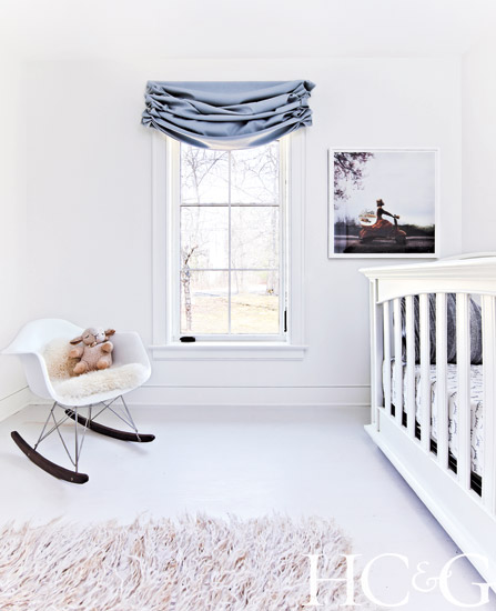 Benjamin Moore’s White Ice covers the walls in daughter Winter’s room. A sheepskin cushion sits on an Eames rocking chair; the roman shades are made from Kravet’s Soho Solid in Cloud.