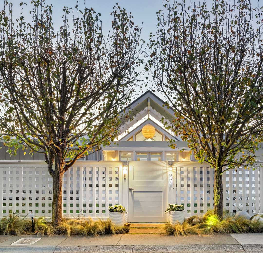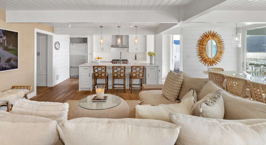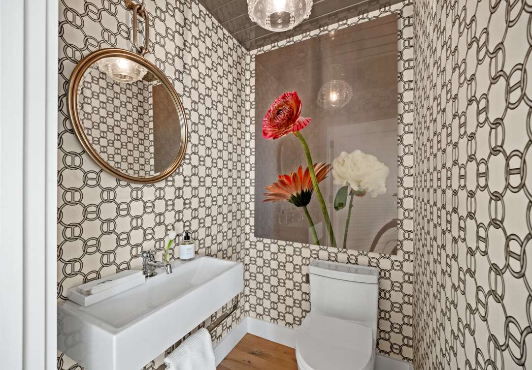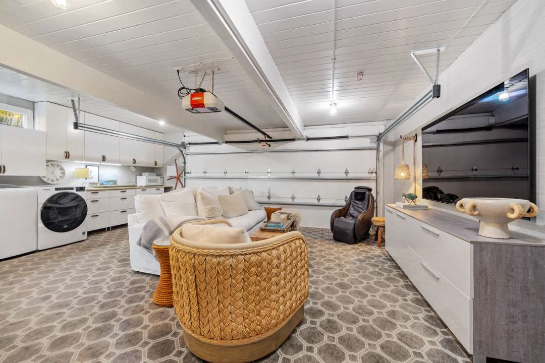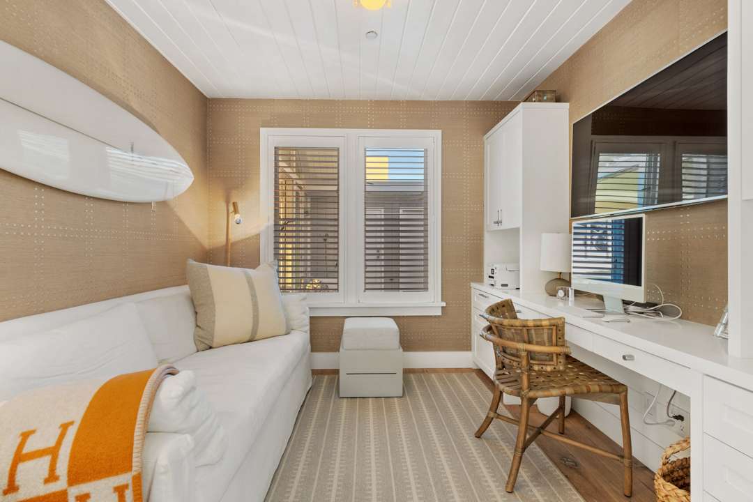 Inside, the residence totals four bedrooms and two-and-a-half bathrooms. It boasts an open floor plan, post-and-beam construction, and great zones for indoor/outdoor living. Vaulted ceilings in the great room allow for plenty of light to flood in through the wall of sliding glass doors. Bespoke, designer touches also abound. A powder room with an Hermes wallcovering and Juliska light fixture? Yes, please. The owners also oh-so-coolly converted the two-car garage into a hangout lounge.