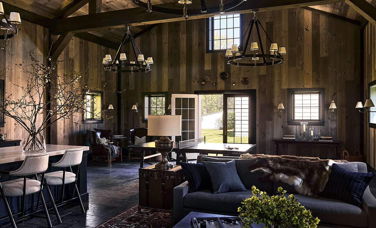 A renovated barn is filled with a sophisticated Earth-toned palette.