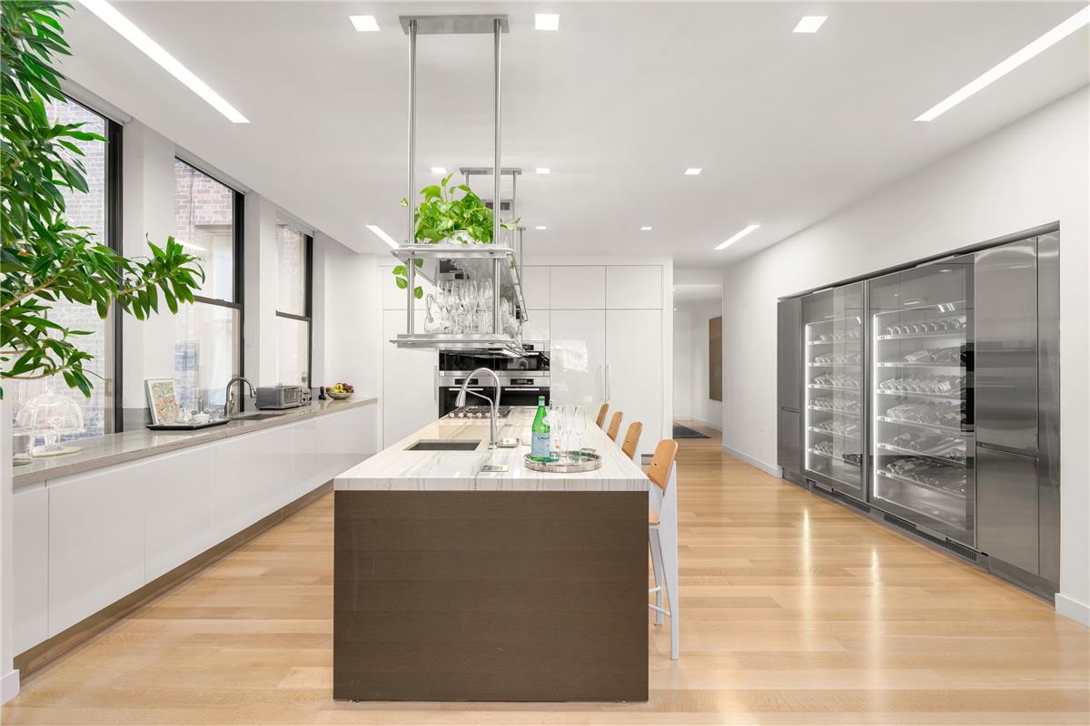 The kitchen, located on the 5th floor as well, is stacked with stainless steel Miele appliances, accented with marble countertops and includes an open dining area.