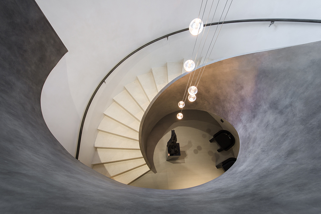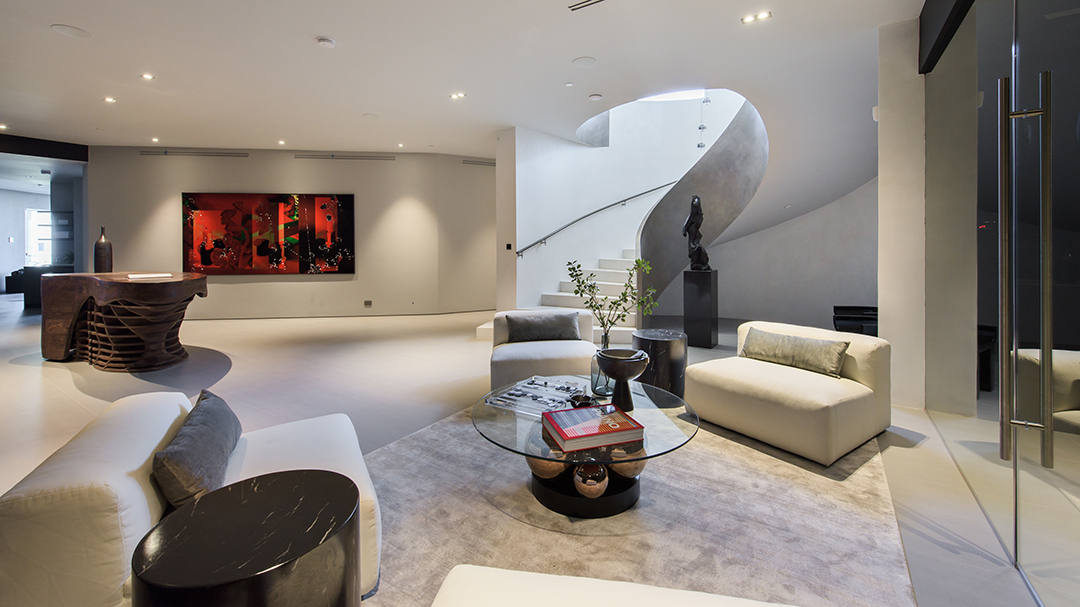 Start with the rooftop garden that is also an Aston Martin-worthy auto gallery, holding more than 20 cars on an Italian marble driveway. Enter the glass-walled elevator that gives a sense of why the home is said to be “a design for first-class wellness.” The 10,000-square-foot backyard, 70-foot infinity pool, zen garden, sauna, and 300 tree fruit orchard all certainly move one towards “…a state of complete physical, mental, and social well-being”. The real transcending quality, however, might be the custom Toshi Kawabata functional artwork visible throughout the home.