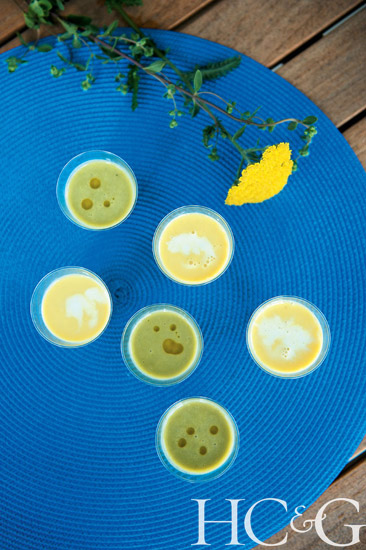 Chilled soup shots in two choices—corn, and pea with fennel.