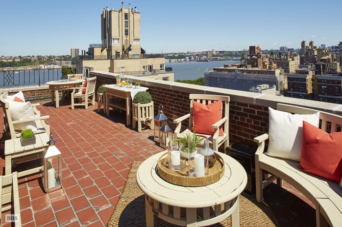 This gracious penthouse features a 1,300-square-foot wraparound terrace and original hardwood floors throughout. It is laid out in the “classic six” style with a light-filled living room, formal dining room, kitchen, 2 bedrooms and a smaller maid’s room, which could also function as an office. The master suite features a walk-in closet and access to the terrace.