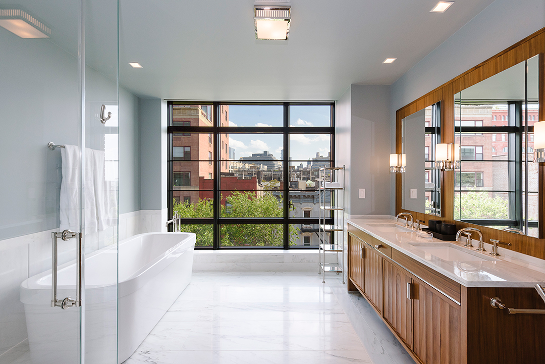 The 4,031-square-foot apartment features floor-to-ceiling casement windows that flood the entire space with light and its first level is occupied by gracious entertaining spaces. The expansive great room directly accesses a sprawling landscaped terrace overlooking the Hudson River and a custom kitchen is outfitted with top-of-the-line appliances. A library/media room completes this level and could also function as a guest suite. The upper level houses the rest of the bedrooms including the master, which boasts views of the Hudson River and Freedom Tower and also includes a private terrace.
