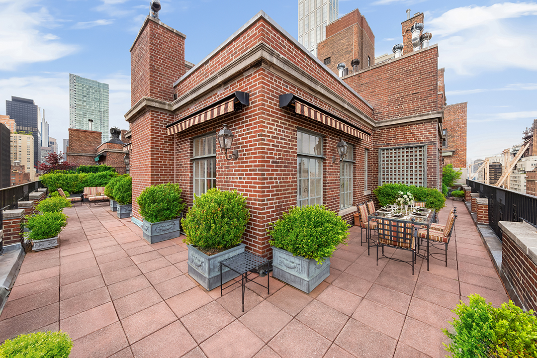 Tucked between Sutton Place and 1st Ave, the penthouse’s location is also a huge selling point. The wrap-around terrace allows for jaw-dropping views of Manhattan and the East River. The views carry over into the house, with the living room presenting the greatest indoor-outdoor feel.