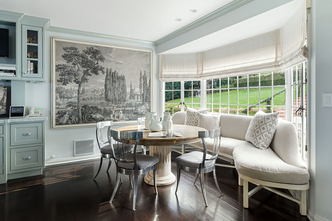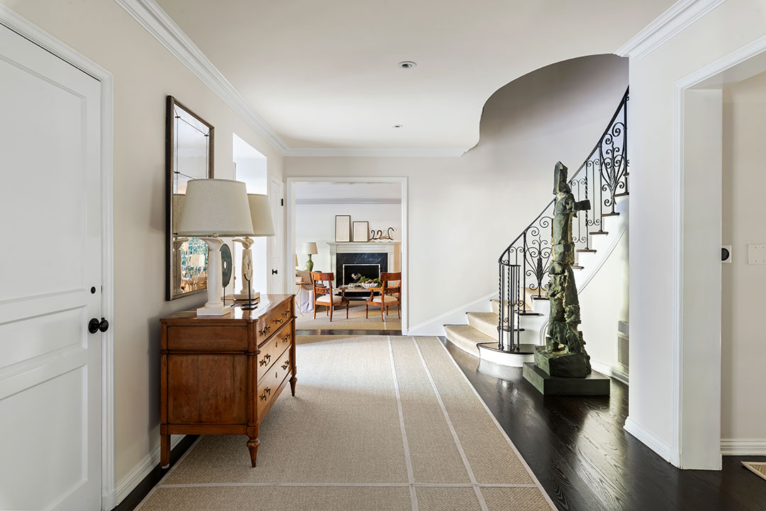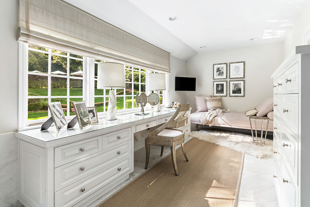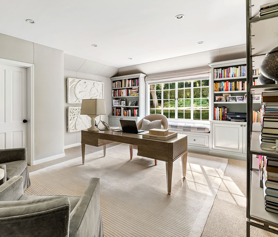The 5,513-square-foot home designed by architect Wallace Neff totals five bedrooms, six full bathrooms, and one half-bath. Charming interiors include hardwood floors, fireplaces, and an updated chef’s kitchen. Outside, 2.7 acres of meticulous grounds await, including an expansive brick patio, a swimming pool with a diving board, a pool house, and a writer’s cottage.