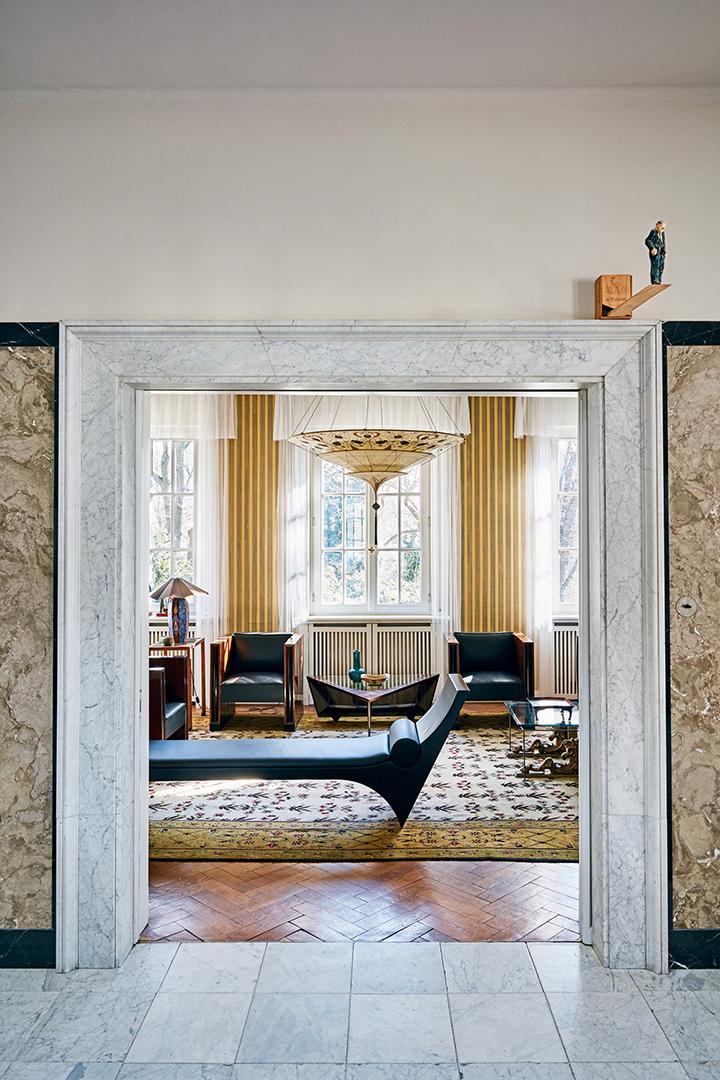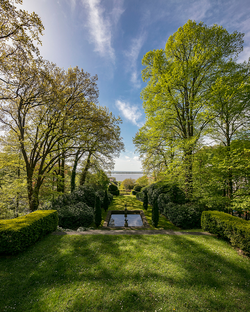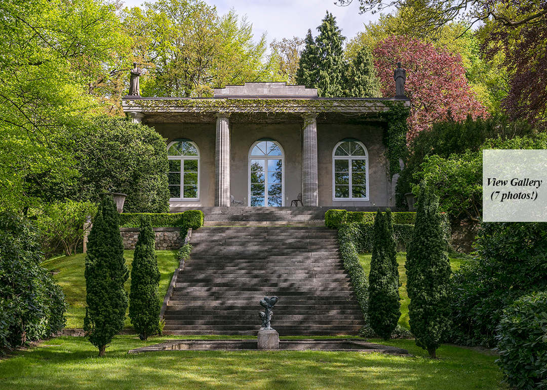 Karl Lagerfeld, longtime creative director of Chanel and Fendi, is practically a Parisian now, but twenty years ago the Germany-native owned this magnificent Roman-style villa in the Blankenese neighborhood of Hamburg. Since Lagerfeld is always fashionable from head to toe with white hair, black sunglasses, and high collar shirts, it’s no surprise that he redecorated it to his high-fashion taste. Some of the interiors remain exactly how he left them, which may be a factor in the €10 million price tag (approximately $11.7 million in USD).Villa Jako has plenty of desirable features that have nothing to do with its former celebrity owner, however. Built in the 1920s, it shines with grand proportioned rooms and lavish details like a gold leaf-covered ceiling in the living room. On the first floor, an atrium is flooded with light and opens to three exquisite receptions rooms. Three bedrooms are also housed on this level, and more treasures lie on the home’s other two floors.Outside, stairs lead down to a romantic, tiered garden with water views. Statues and manicured greenery create an enchanting atmosphere that seems crafted specifically for a Chanel photo shoot.The Engel & Völkers Market Center Hamburg Elbe is brokering the pristine property, but has not listed it online.
