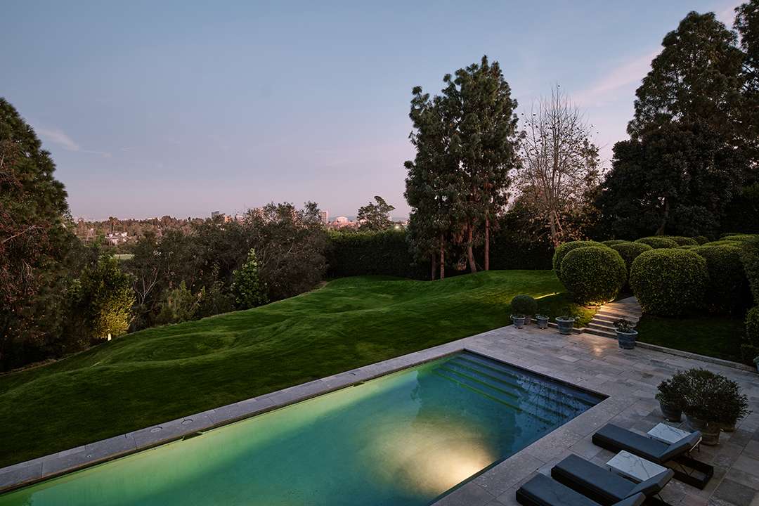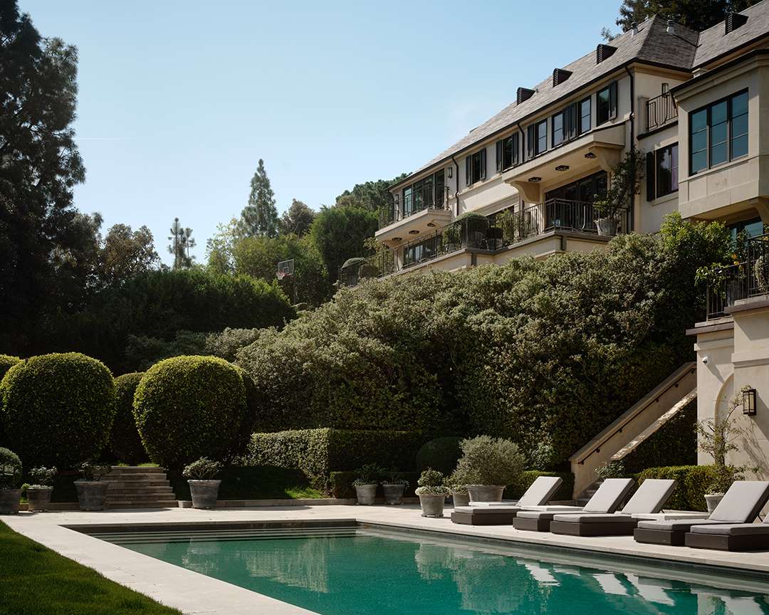 In comparison, the grounds are more traditional in style but still definitively grand. Across the 1.24-acre property, there’s a pool and pavilion for lounging as well as gardens and fountains. Wearstler collaborated with Art Luna Garden to bring these outdoor areas to life.