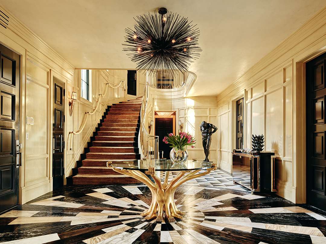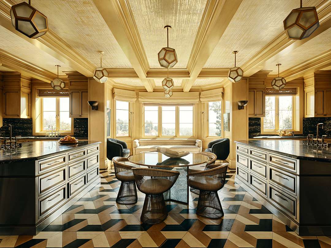Over 10 years ago, Wearstler worked with M. Brian Tichenor of Tichenor & Thorp Architects in a gut-renovation of the circa-1939, three-story Georgian Revival, according to AD. By the time they were finished, she had added 3,000 square feet of living space to the original footprint and truly blurred the lines between home and art with details like pyramid-paneled walls in the family room, an edgy stainless steel island in the chef’s kitchen, and a circular entry with flooring that interweaves marbles of different tones. You can also feast your eyes on black-and-white striped walls, spikey and geometric light fixtures, and one-of-a-kind furnishings by Wearstler throughout the spaces.