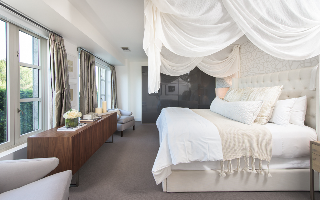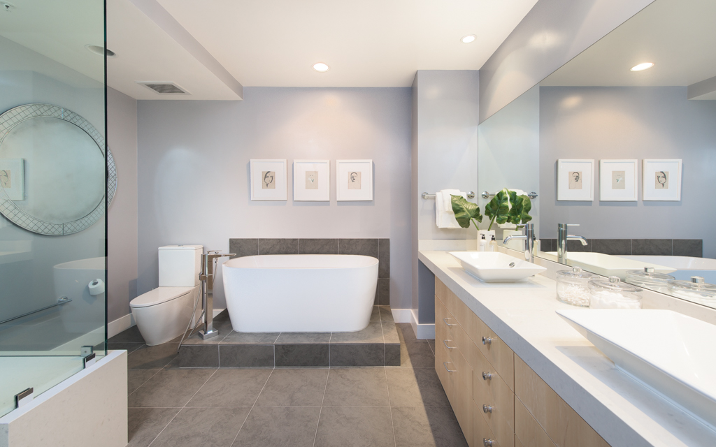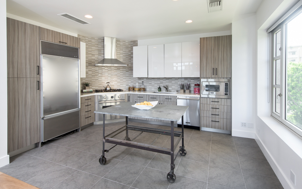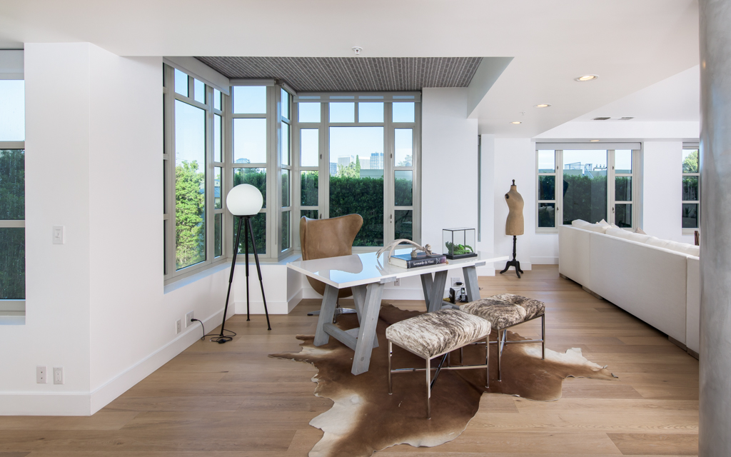 The 2,068-square-foot corner residence “feels like a garden home,” according to the listing, because of its airy open floor plan and wraparound views of greenery and the LA skyline. It features high ceilings and hardwood floors throughout as well as a designer outfitted kitchen with Sub-Zero and Viking appliances. The master suite comes complete with a spacious walk-in closet and luxurious master bathroom.