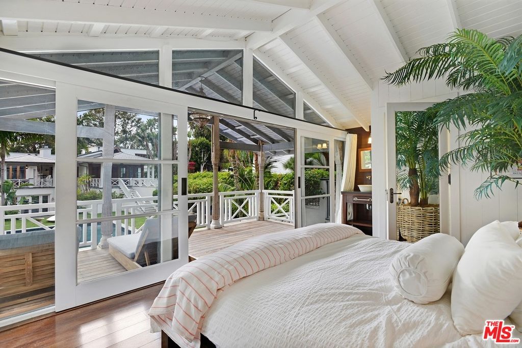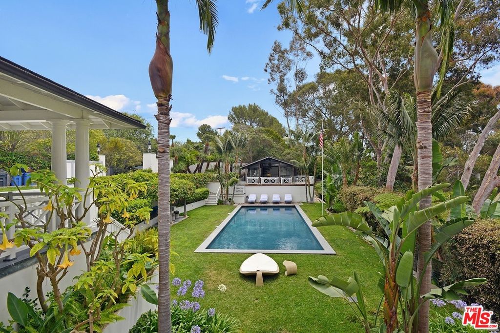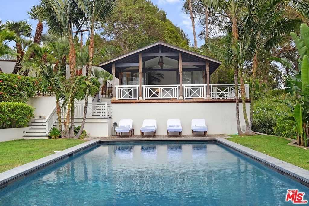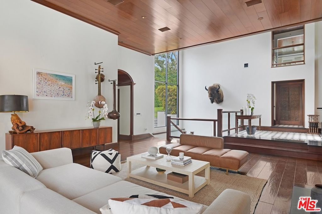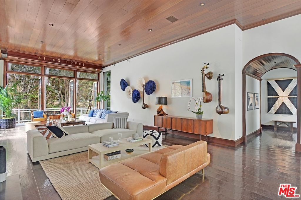 The home sits on a 1.5-acre lot in Point Dume behind gates at the end of a cul-de-sac. The interiors span 8,304 square feet and feature open concept living spaces on the entertaining floor as well as upper and lower levels that house the bedroom suites and a sprawling family room, respectively. Glass doors throughout the living spaces access the outdoor spaces, where there is a sunken courtyard with a pool, an outdoor shower and an outdoor lounge.