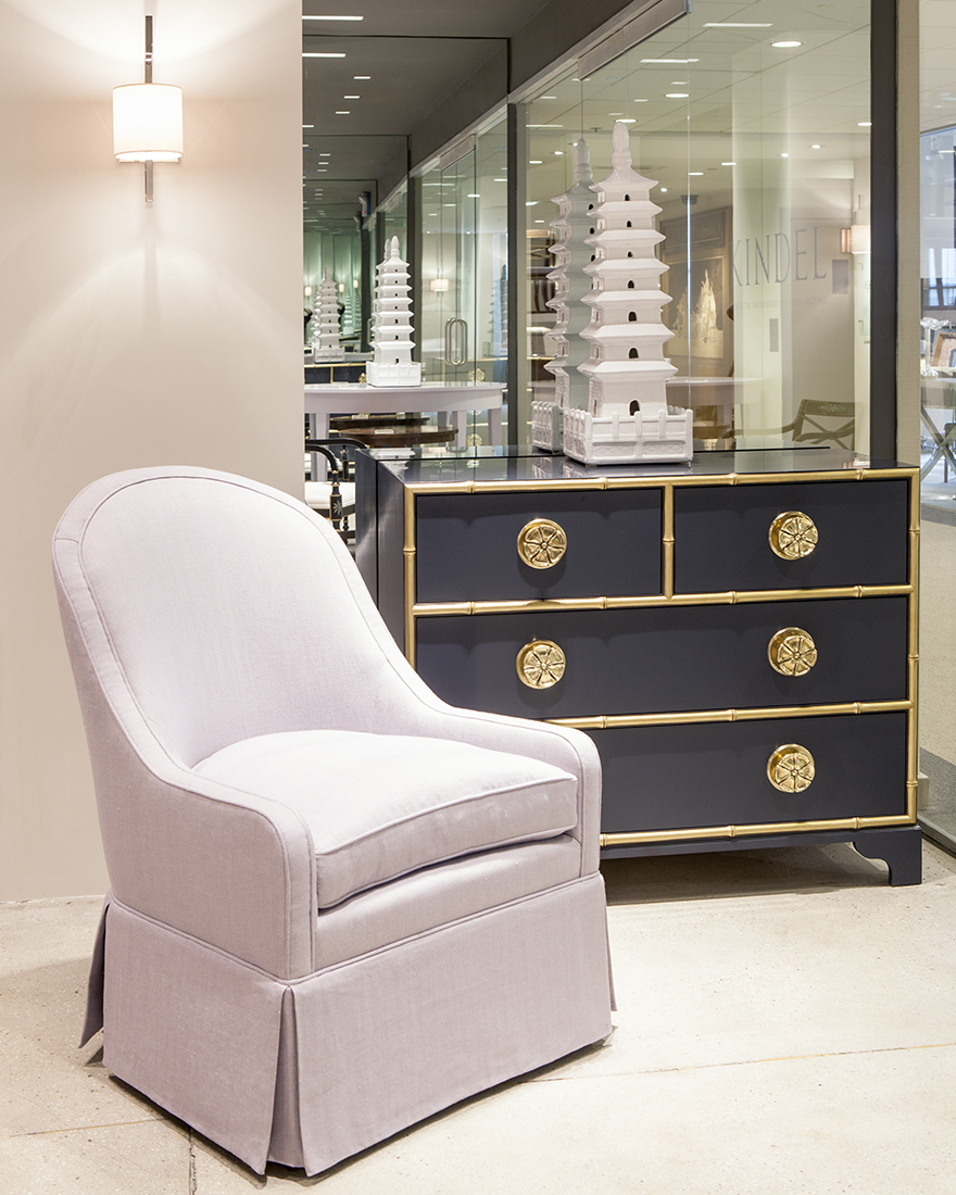 EC: My favorite piece in the showroom is the painted Federal chaise/sofa wrapped in a golden yellow waxed linen. It’s the synthesis of all that Kindel represents—superb quality with a forward-looking POV.