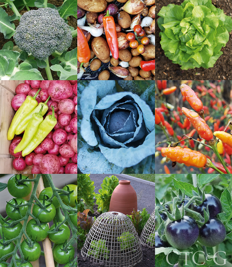 Color is prevalent even in the large edible garden, and a variety of crops include broccoli ‘Arcadia’; a mixed summer harvest; butterhead lettuce ‘Sylvesta’; pepper ‘Firecracker’; tomato ‘Black Zebra’; a plant-protecting bamboo cloche and a terra-cotta rhubarb forcer; tomato ‘Dark Cherry’; pepper ‘Hungarian Hot Wax’ and potato ‘Red harvest’; cabbage ‘Ruby Ball’.