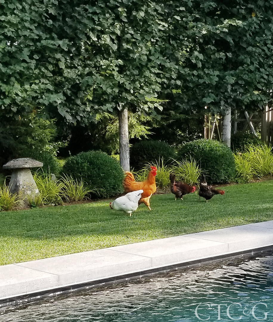 The flock of hens and a happy rooster roam the garden.