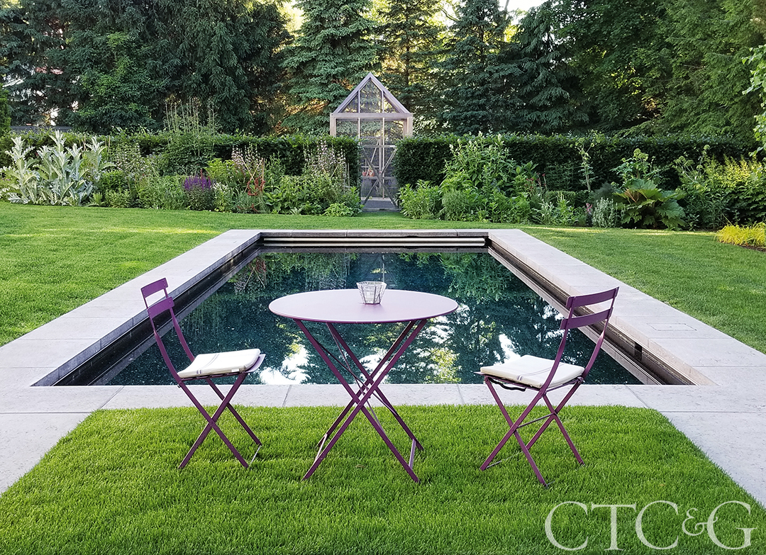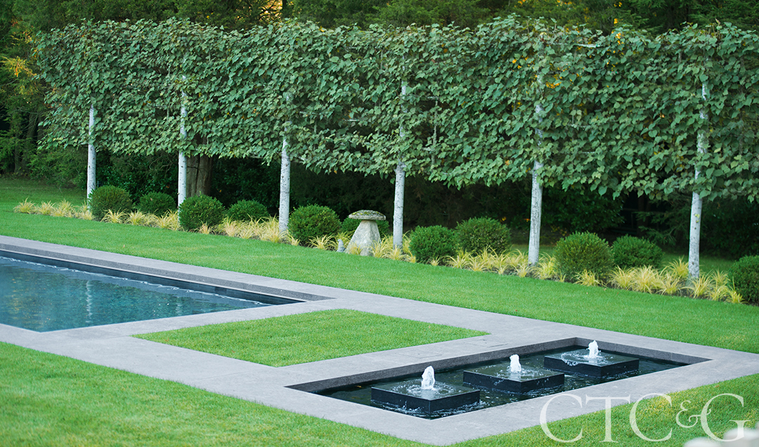 A swimming pool and water feature garden sit at the rear of the house. An aubergine bistro table and chairs by Fermob allow for a relaxing poolside moment. Three fountains add to the tranquility of the space with a striking backdrop of espaliered Tilia cordata trees.