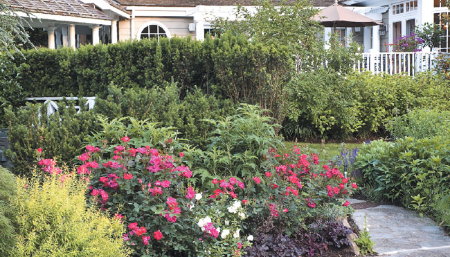 Leading to the house from the pool, an informal mixed border pops with double red Knock-Out roses, Spirea “Mellow Yellow,” “Flower Carpet White” rose, “Obsidian” Heuchera and Echinops bannaticus “Taplow Blue.”