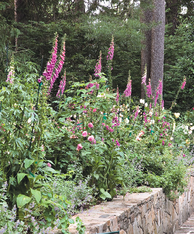 “This raised bed initially was planted with roses, but foxglove and other ‘volunteers’ seeded from the compost, and perennials started coming through,” says Brown. She added irises and nepeta (catnip) spilling over the walls for more of a cottage-garden feel.