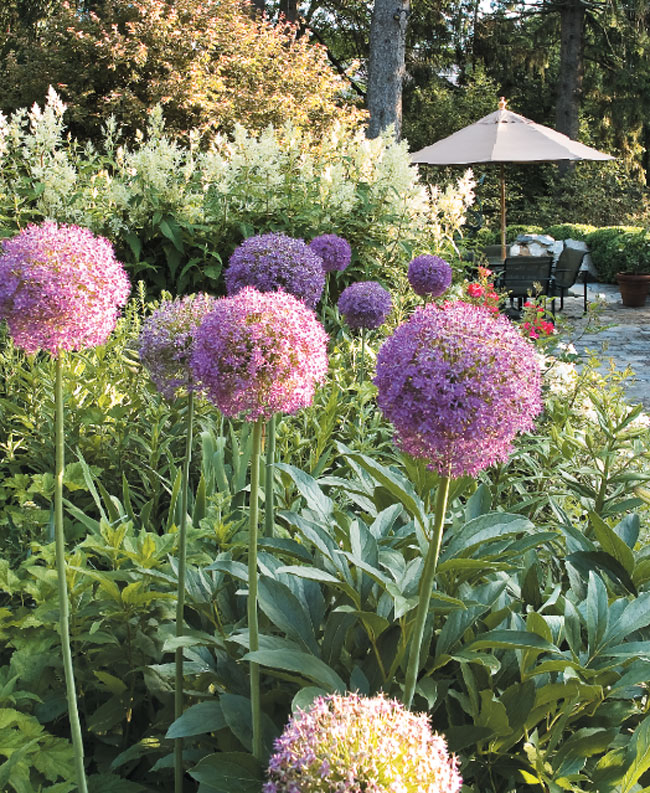 Allium “Gladiator” and Persicaria polymorpha (giant fleeceflower) bloom amid the green foliage of peonies and iris.