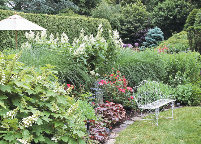 Oak-leaf hydrangea, Persicaria polymorpha (giant fleeceflower) and Miscanthus sinensis (Chinese silvergrass) are the perfect contrast to bright red Knock-Out roses, Allium “Gladiator” and Baptisia australis “false indigo.”