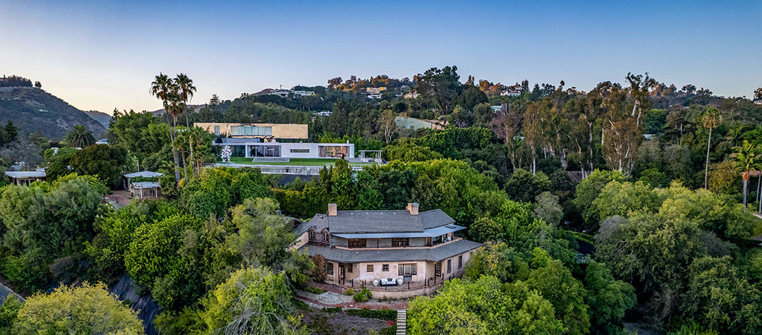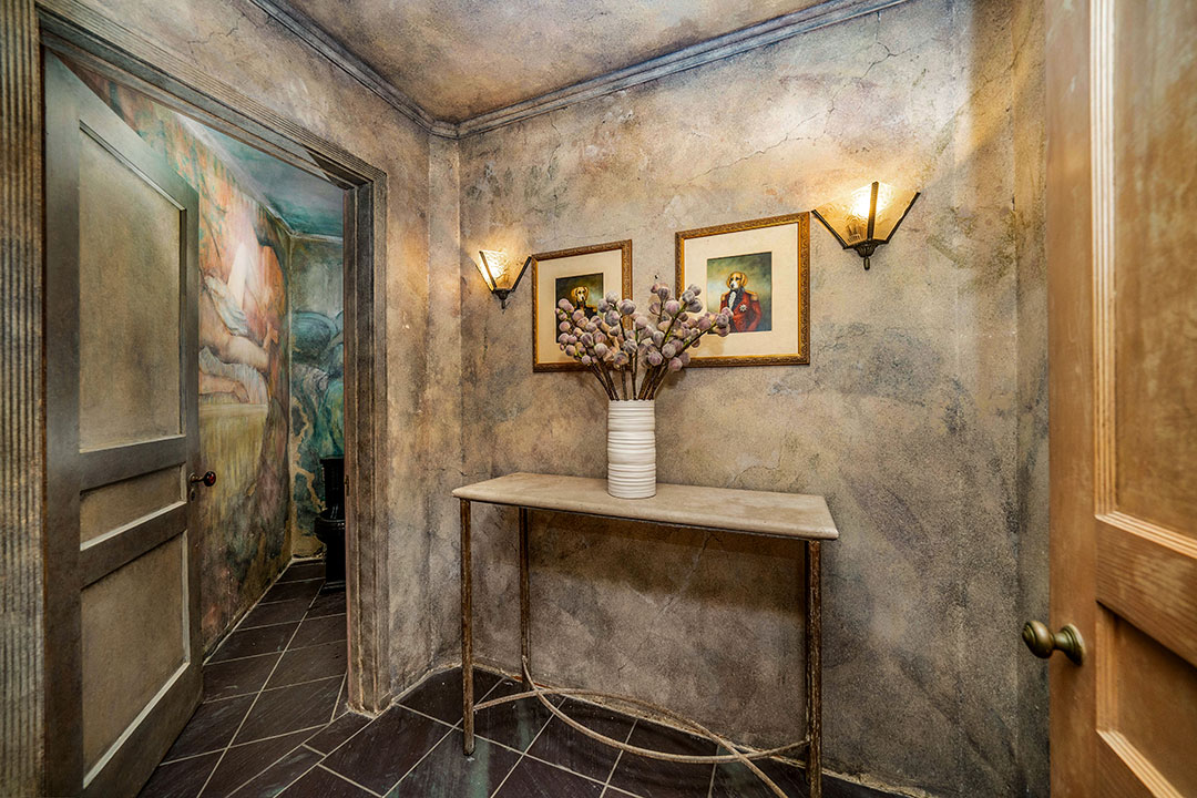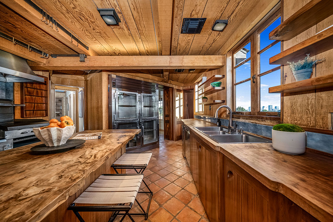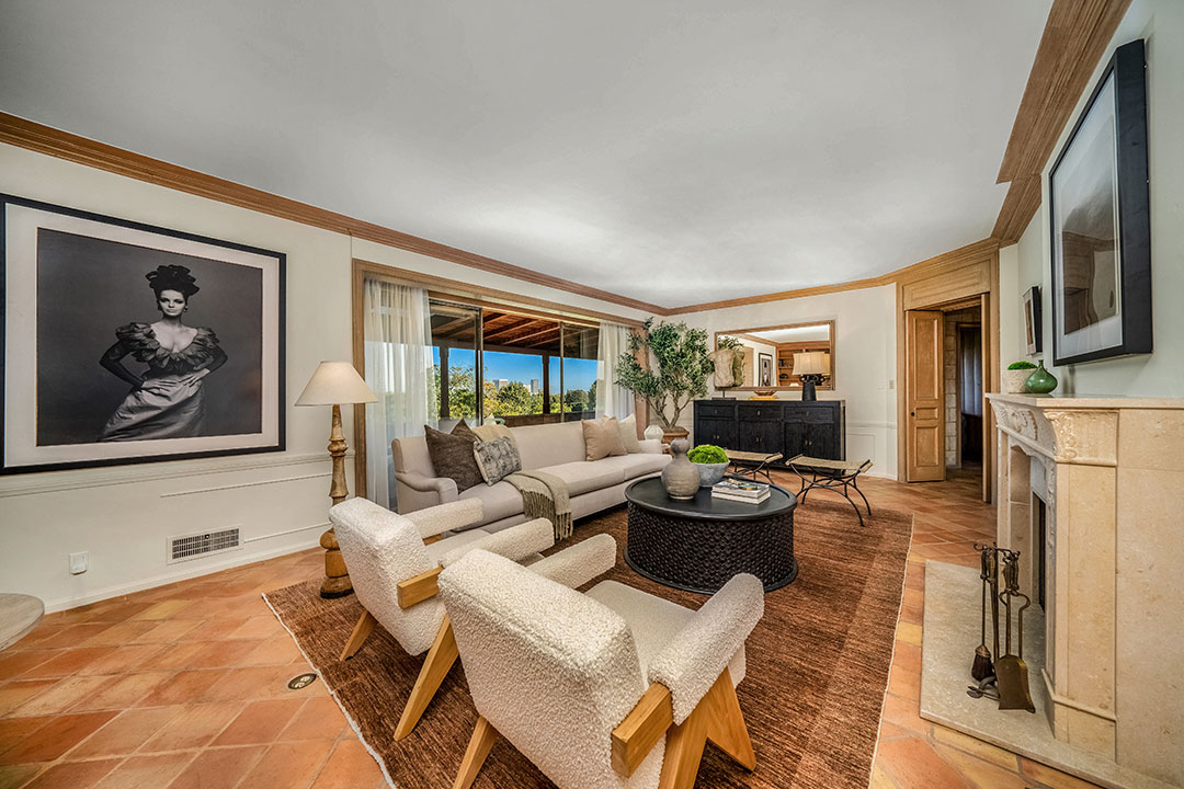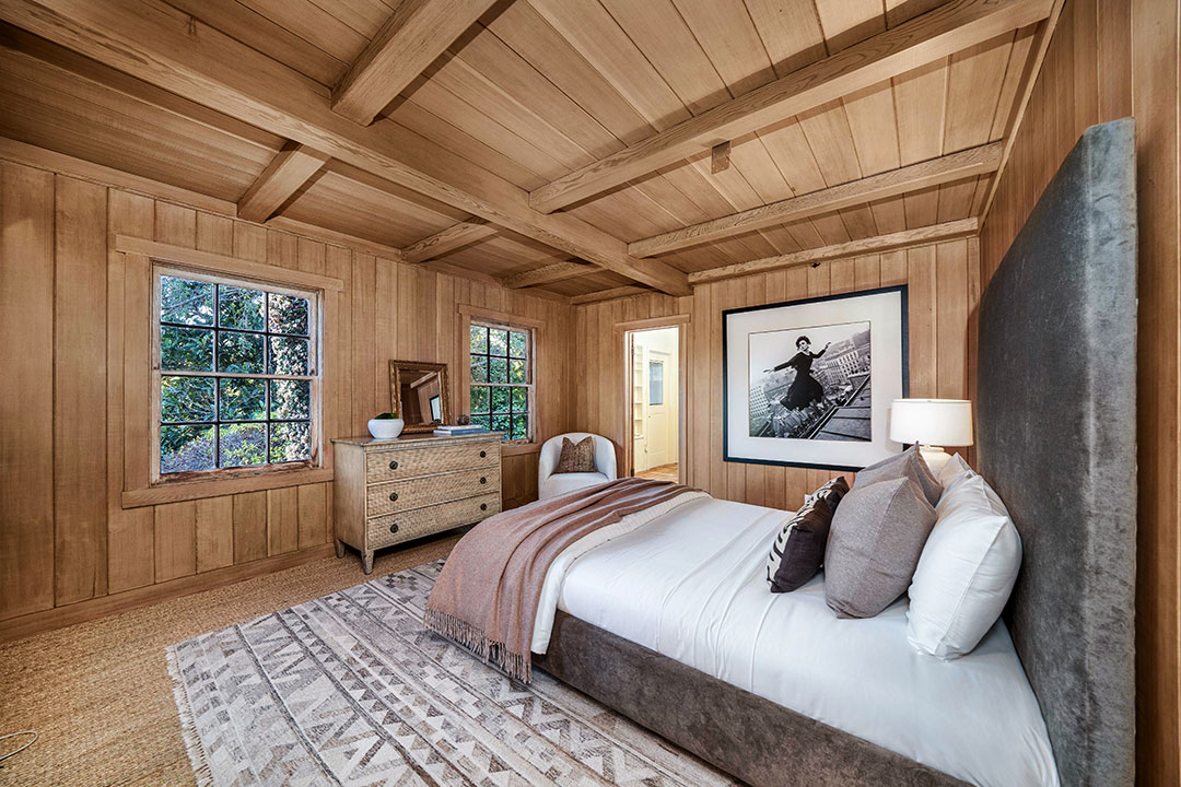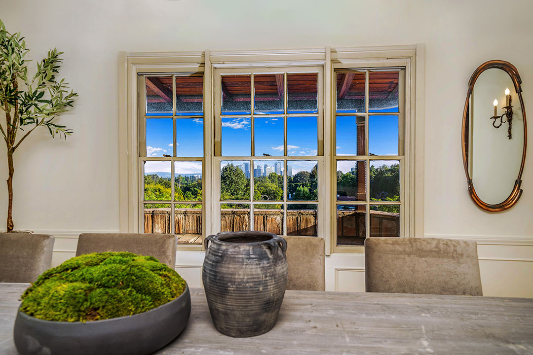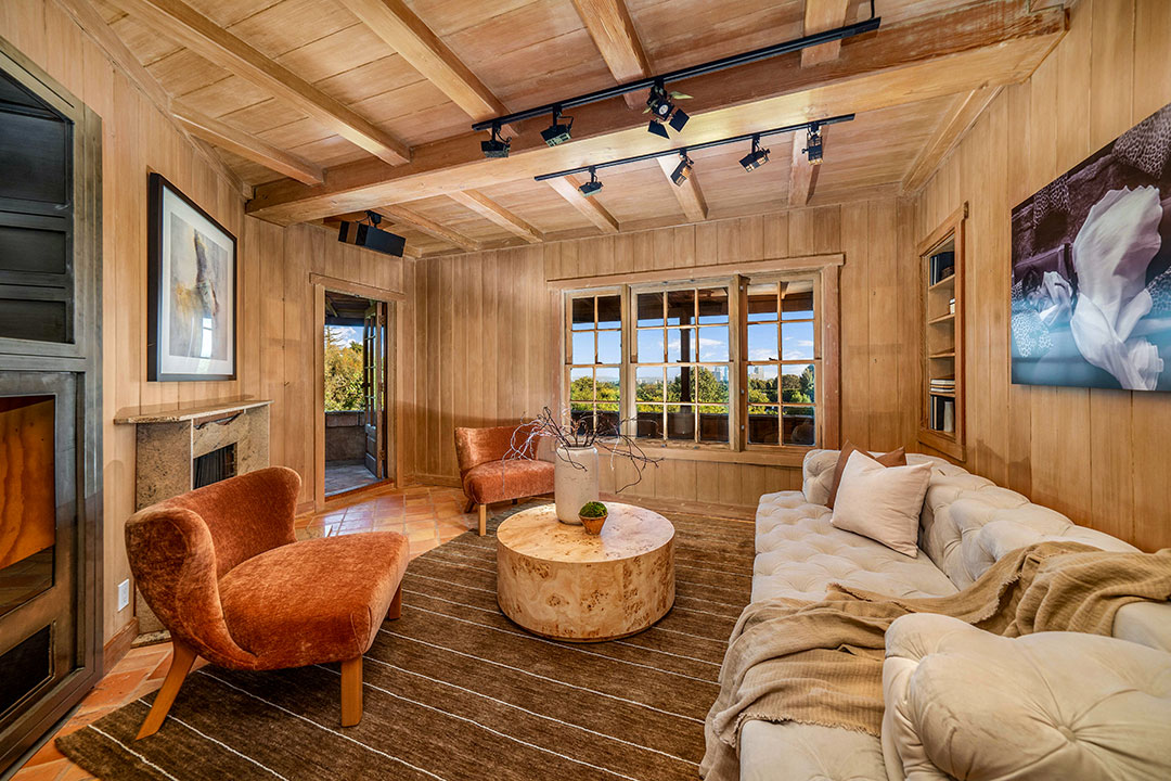 The English-country style abode is timeless, yet comfortable. While the home isn’t necessarily flashy (like some Beverly Hills homes), Degas-inspired powder room is certainly a wow-factor. A wood-paneled study, fireplaces, and a rustic farmhouse kitchen add a sense of warmth throughout. Windows frame views of Los Angeles in the distance. Of course, Sokolsky’s images hang throughout the five-bedroom, four-bathroom home.