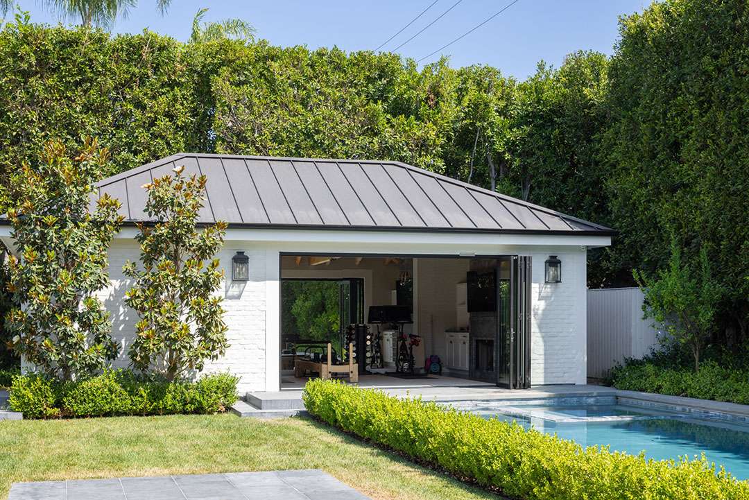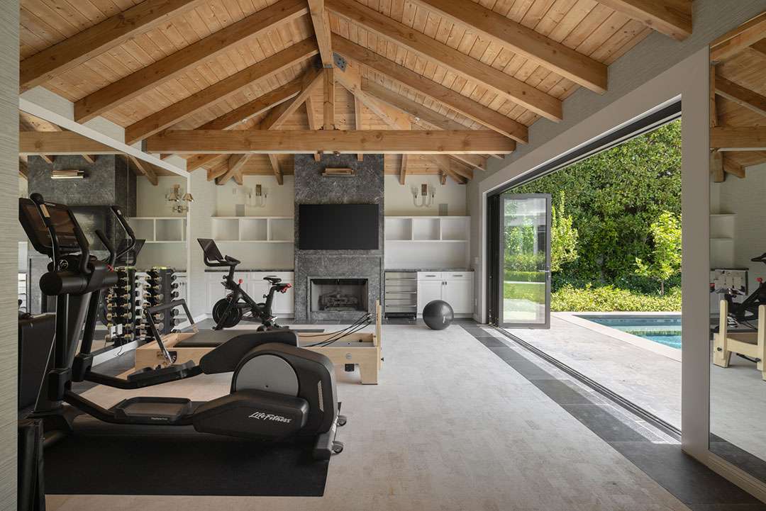 As one would expect from the home of a longtime toy company CEO, the home is appropriately set up for work and play. Of course, there is a home office and formal gathering spaces for elegant entertaining. There’s a sauna for unwinding as well as effortlessly relaxing color palettes. Outside, the half-acre property is apt for fun and games, too, with a swimming pool and spa, outdoor fireplace, and plenty of space for entertaining. A separate structure adjacent to the pool is currently configured as a fitness studio, but may be converted into a guest house—or perhaps a playroom.