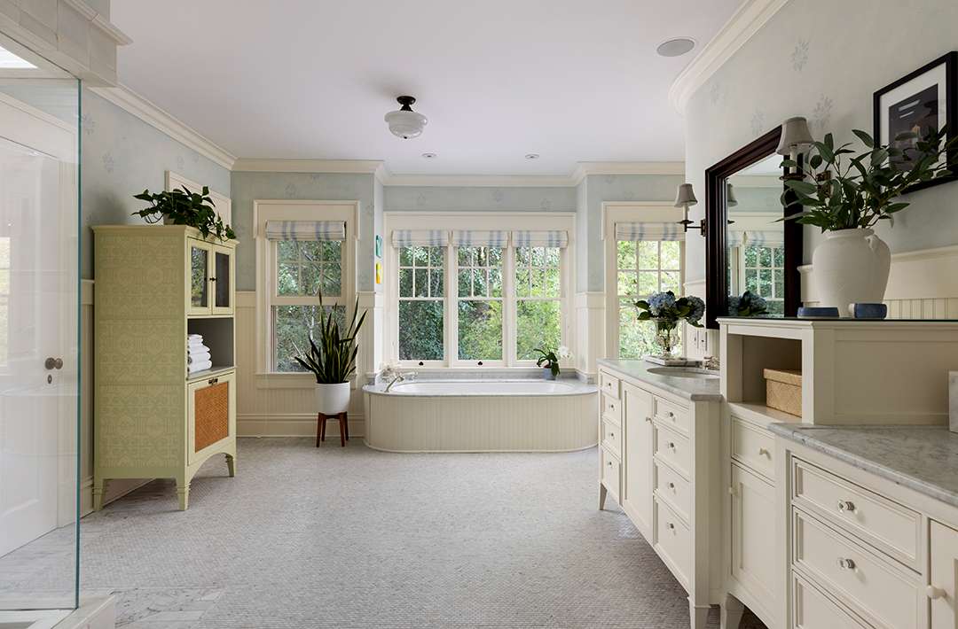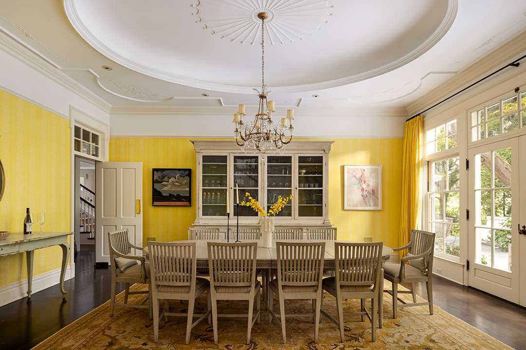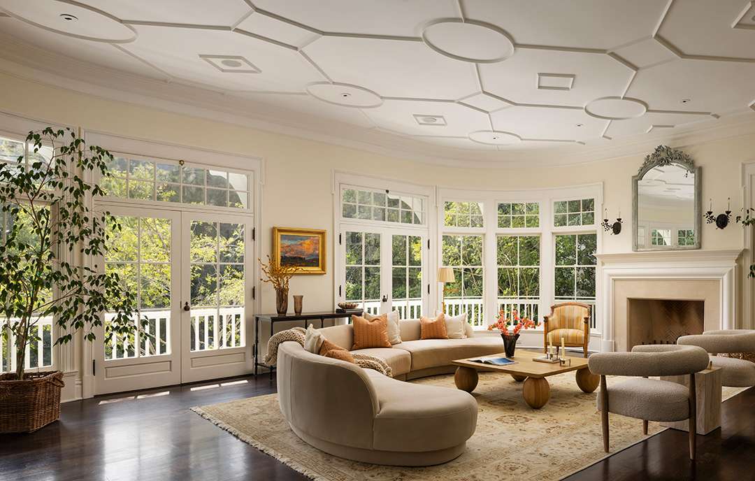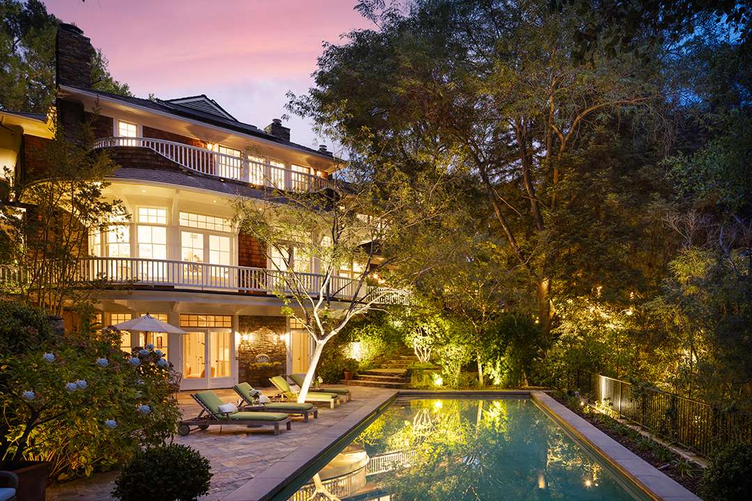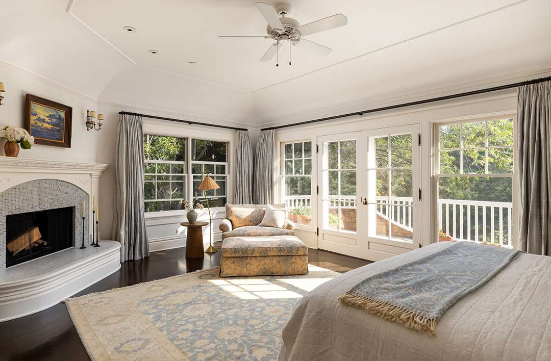 The private, gated estate offers grounds adorned in blooming hydrangeas and wisteria, plus classic Los Angeles views worthy of Hollywood royalty. Though its 10,595-square-foot house was built 22 years ago, its warm sophistication is what keeps it so aspirational and endearing. Decorative ceiling moldings, shingles on the exterior, and vast porches, all make up the home to make it look and feel delightfully older with character in the chicest way possible. Curved glass windows, French doors, and grand ceilings also await.