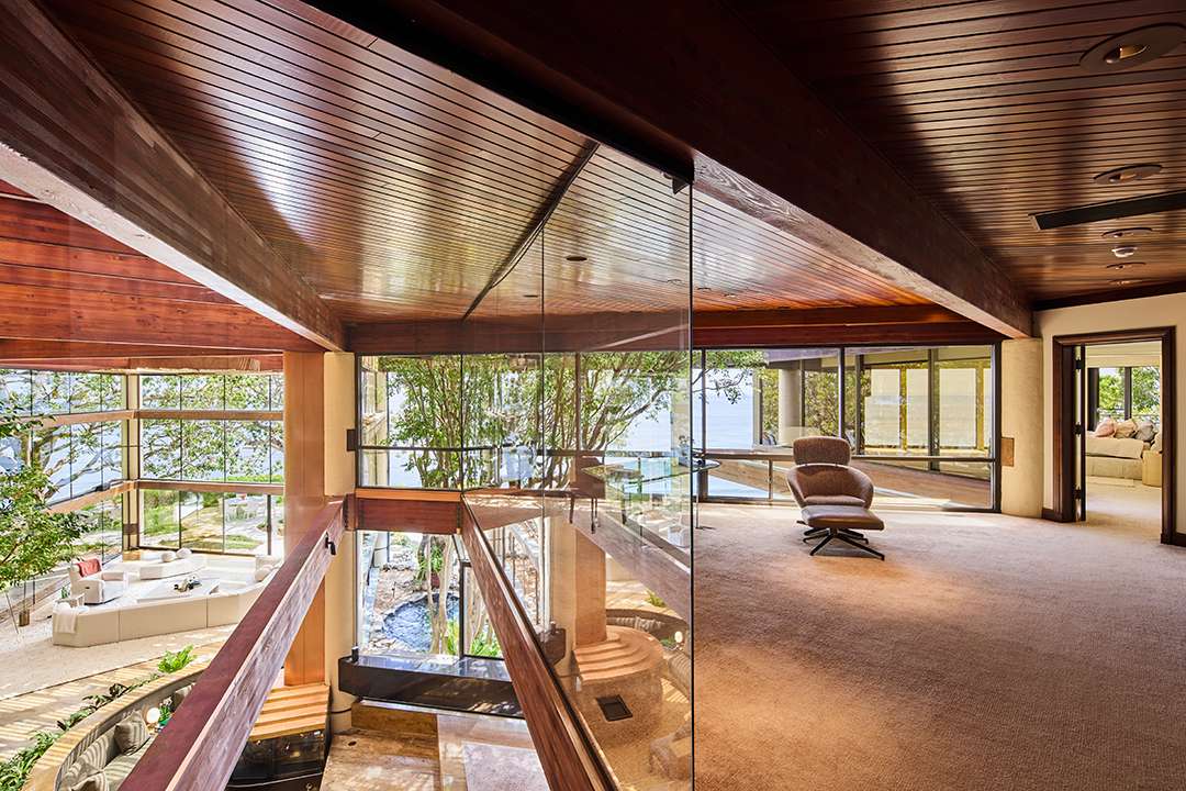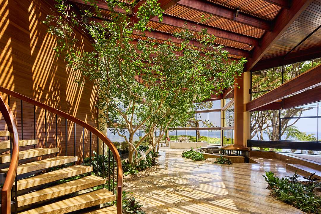 Spanning four acres across four parcels, the estate is perched atop bluffs looking straight out to the Pacific Ocean. It’s most defining feature is the modernist mansion designed architect Edward R. Niles and set steps from the cliff’s edge. It’s clad in glass on the exteriors and rich wood inside. Stepping into the 7,083-square-foot gem, it’s the arboretum pavilion with 30-foot-tall glass, a wood latticed ceiling, and a incredibly cool copper and glass sunken fireplace that steals the show. Simultaneously displaying tranquility and a “more is more” sensibility, it even holds full-sized indoor trees, sculptural light fixtures, and sunken built-in seating harkening to glamourous decades past.