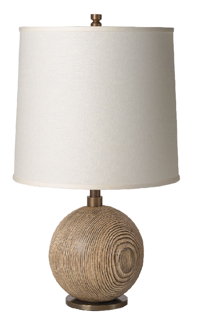 This petit round wooden table light has a hand-worked surface with a weathered look and a sophisticated elemental shape. Copake table lamp, designed by Alan Wanzenberg, Remains Lighting, Greenwich, 203-629-1000, NYC, 212-675-8051, remains.com.