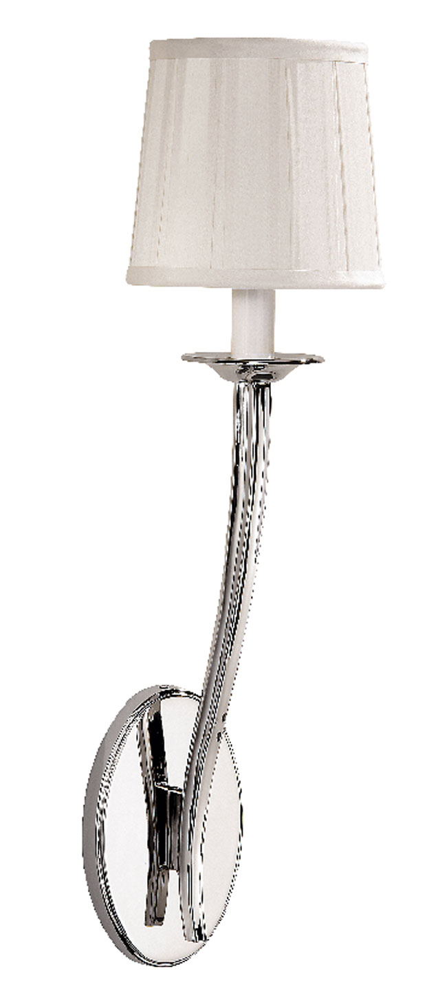 The solid brass wall sconce #8349 has a polished-nickel finish and round, pleated fabric shade. Decorative Crafts, (T), Greenwich, 203-531-1500, decorativecrafts.com.